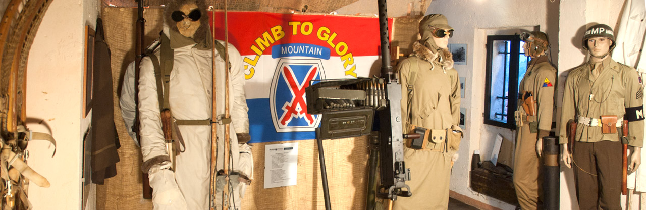 São visíveis armas, fardas e objetos de uso diário pertencentes aos soldados da Wehrmacht, aos brasileiros da FEB e aos norte-americanos da 10a Divisão de Montanha.